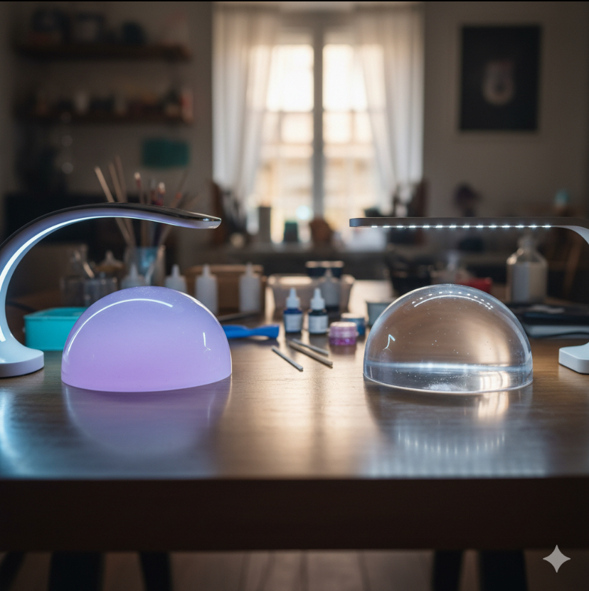 その理由は、レジン液とジェルネイルが硬化する基本的な原理(紫外線重合反応)が同じであり、最近のライトはその両方に対応できるように作られているからです。具体的には、ライトの多くがレジン用と同じく「UV-LEDハイブリッドタイプ」であり、対応する波長も「365nm + 405nm」のものが主流になっています。この波長に対応していれば、市販されているほとんどのUVレジン液、LEDレジン液を問題なく硬化させることが可能です。