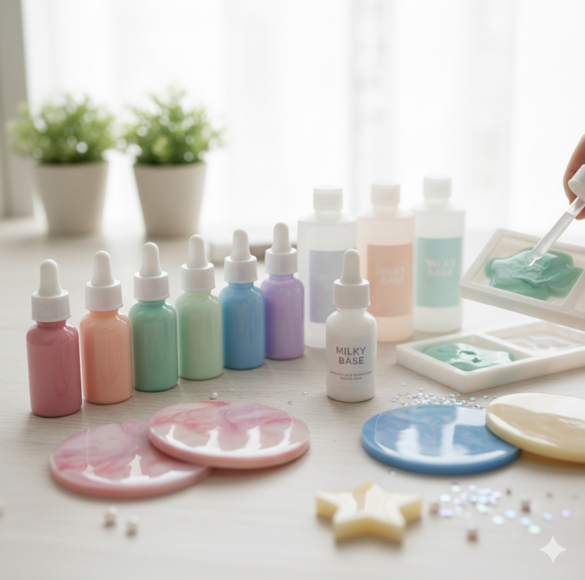 作り方は非常にシンプルで、お好みの色に「しろ」の着色剤を混ぜるだけです。この時、成功の鍵を握るのが「しろ」の性能です。「作家のためのレジン 着色剤」の「しろ」は、隠蔽力(下地の色を隠す力)が非常に高く設計されており、少量でもしっかりと色を白く濁らせることができるため、色が薄まっても鮮やかさを失わない、理想的なミルキーカラーが作りやすいと評判です。
