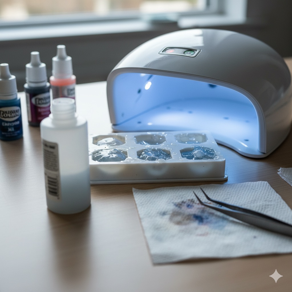 「艶 009」のようなUVレジンは、紫外線が透過することで硬化します。そのため、透明または半透明のシリコンモールドの使用が絶対的な推奨条件となります。黒や濃い青、不透明な白などのモールドは、光をほとんど通さないため、モールドと接している面が硬化不良を起こす原因となります。
