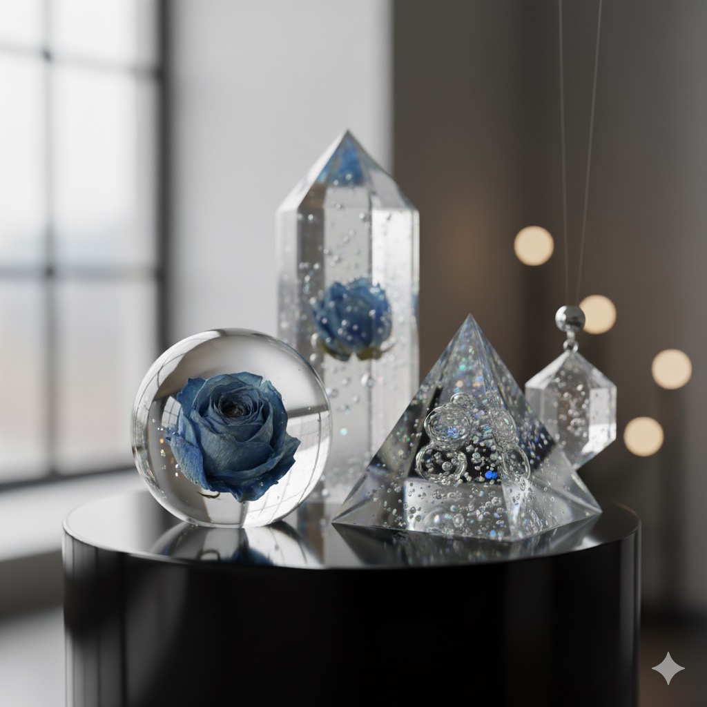 この驚異的な透明性は、特に内部に様々な素材を封入するデザインでその真価を発揮します。繊細なドライフラワーの花脈、天然石の微細な内包物、写真の色合いなどを、歪みや色の変化なく、ありのままの美しさで閉じ込めることができるのです。