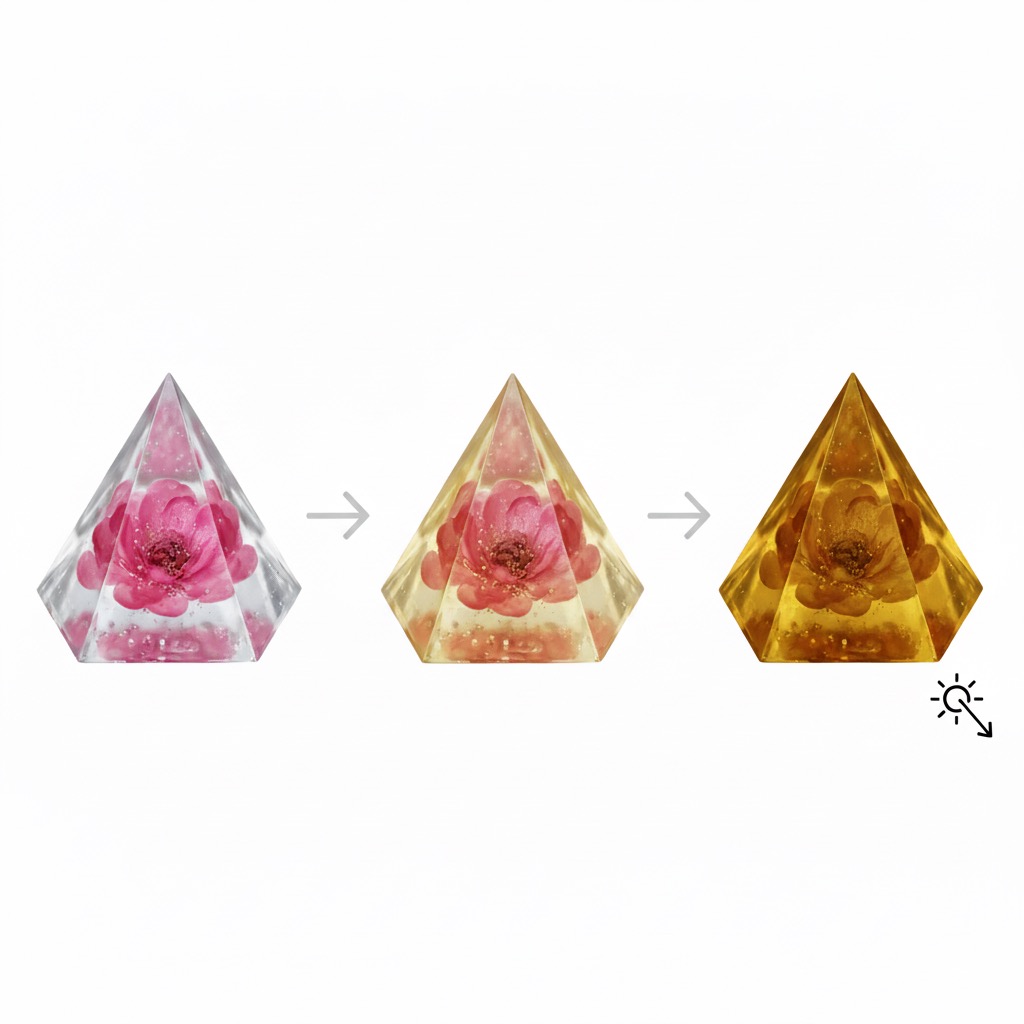 これは製品の不具合ではなく、正常な化学反応です。製品の特性上、紫外線吸収剤や光重合開始剤が高出力のUVライトに反応する過程で、硬化中や硬化直後に作品が一時的に黄色味を帯びて見えることがあります。しかし、この発色は一時的なもので、硬化後の化学反応が安定するにつれて(通常は数時間から1日程度で)、自然に本来の無色透明な状態に戻りますので、心配する必要はありません。