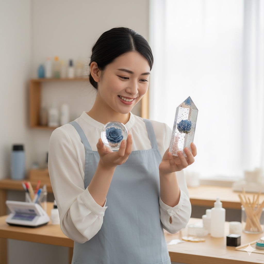 まずは様々なモールドを使って形を作る練習をしたい、色々な着色剤を試したいという段階であれば、コストを気にせず、失敗を恐れずにどんどん使える安いレジン液が最適です。基本的な技術を習得するためのトレーニングパートナーとして活用しましょう。 - 販売用作品・大切な人へのプレゼントを制作する方