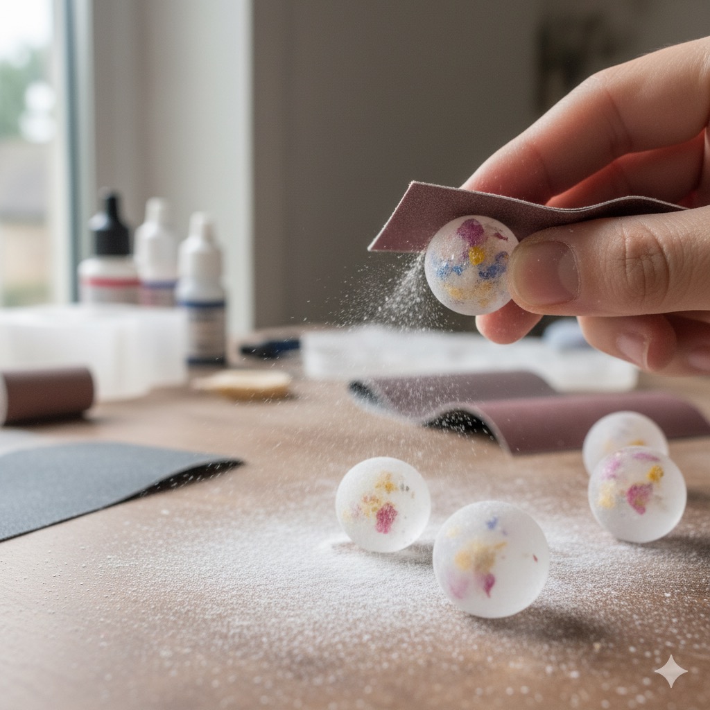 均一に仕上げるには技術が必要ですが、好みのマット加減に調整できる利点があります。この際、レジンの粉塵を吸い込まないよう、マスクを着用して作業してください。