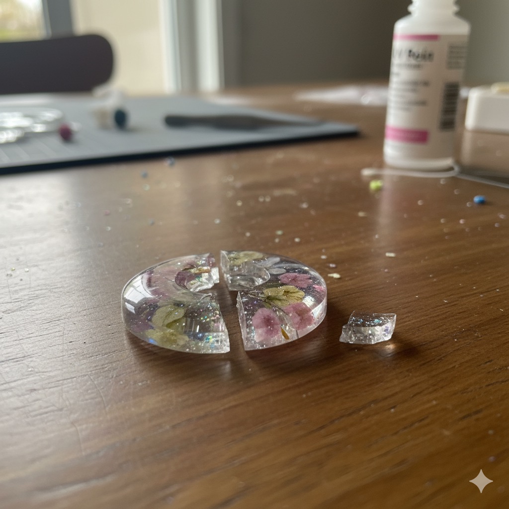 • 2. 割れ・欠け(脆さ 「硬い」のに「脆(もろ)い」。これがレジンの難しいところですよね。ガラスみたいに、ある一点に強い力がかかると、切れるんじゃなくて「パリン!」と割れちゃうことがあります。特に薄い部分や、穴あけの瞬間は要注意です。
