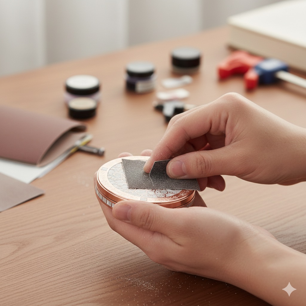ツルツルした鏡の表面には、レジンが食いつくための物理的な「足がかり」がありません。そこで絶対に省略してはいけないのが、物理的な「サンディング(やすりがけ)」という工程です。