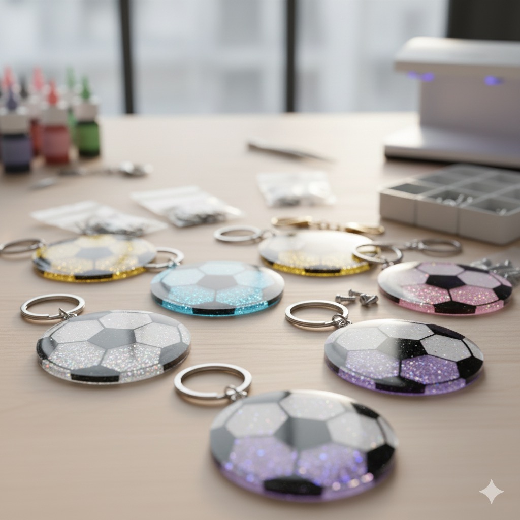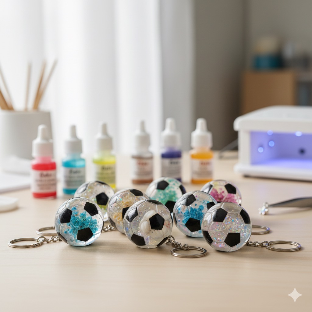 また、レジンの透明感を活かして、ボールの中心に背番号のシールや、チーム名を書いた小さなプラバン、あるいはミサンガの切れ端などを封入するのも素敵です。ラメやホログラムを少し混ぜて、勝利を願ってキラキラさせるのも良いですね。「必勝」の文字を小さく入れた紙を封入するのも、お守りらしくて喜ばれますよ。