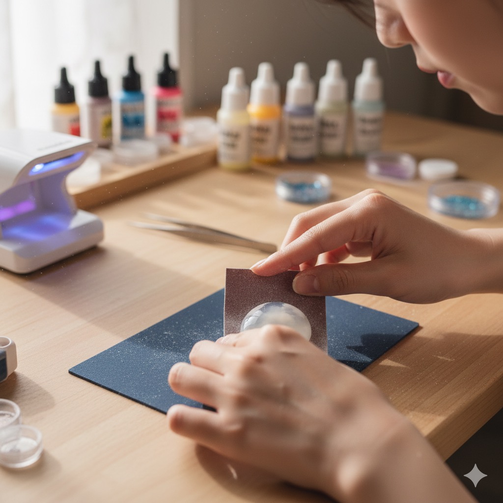 まずは目の細かいスポンジやすり(#1000〜#1500程度)で球体全体を軽く研磨して、あえて曇らせます(これを「足付け」と言います)。その上からプライマーやマットバーニッシュを塗ると、絵の具の食いつきが劇的に良くなります。