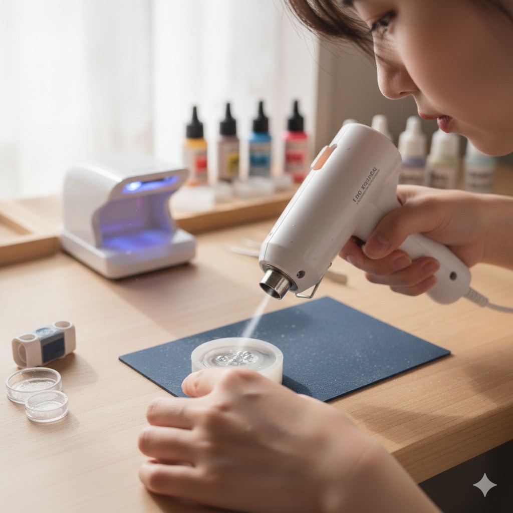 エンボスヒーターでレジンを温めると、気化した成分が発生しやすくなります。作業中は必ず部屋の換気を行い、レジン用手袋やマスクを着用して、直接手や肌に触れないように注意してください。アレルギー等の安全情報については、メーカーの公式サイトも必ず確認しましょう。 (出典:株式会社パジコ『UV-LEDレジンについて』)