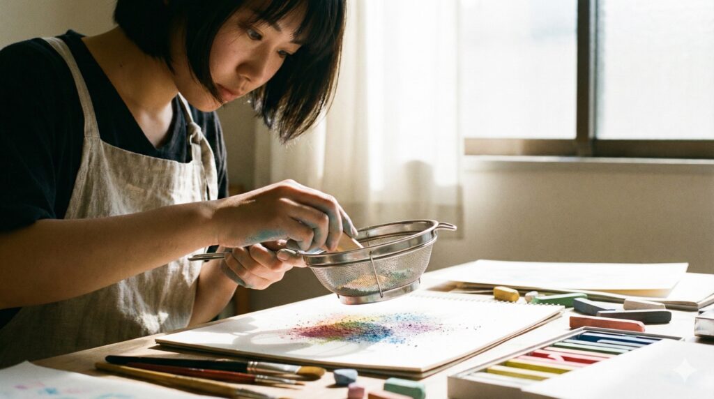 - 削り出し: パステルを茶漉しに擦り付けるようにして削ります。カッターで削るよりも圧倒的に細かく、均一なパウダー状になります。