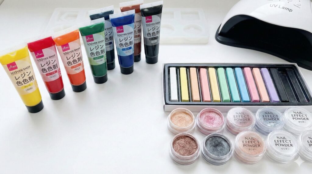 専用の着色剤って、全色揃えようとすると意外とお金がかかりますよね。「ちょっとこの色だけ試したいな」とか「この作品にはほんの少ししか使わないのにな」という時に、わざわざ高い着色剤を買うのは勇気がいります。そこで活躍するのが、私たちの味方、100均や家にあるアイテムです。ここでは、私が実際に試してみて「これは使える!」「むしろ専用品よりいいかも?」と感じたおすすめの代用素材について、具体的な使い方を交えてご紹介します。