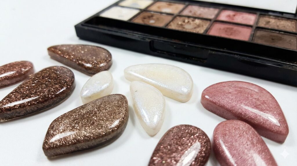 次に試してほしいのが、メイクポーチの奥底に眠っている「使わなくなったアイシャドウ」や「チーク」です。実はこれ、かなり優秀な素材なんです。化粧品グレードの顔料は粒子が極めて細かく、肌にも優しい成分で作られているので、レジンへの馴染みも良いんですよね。