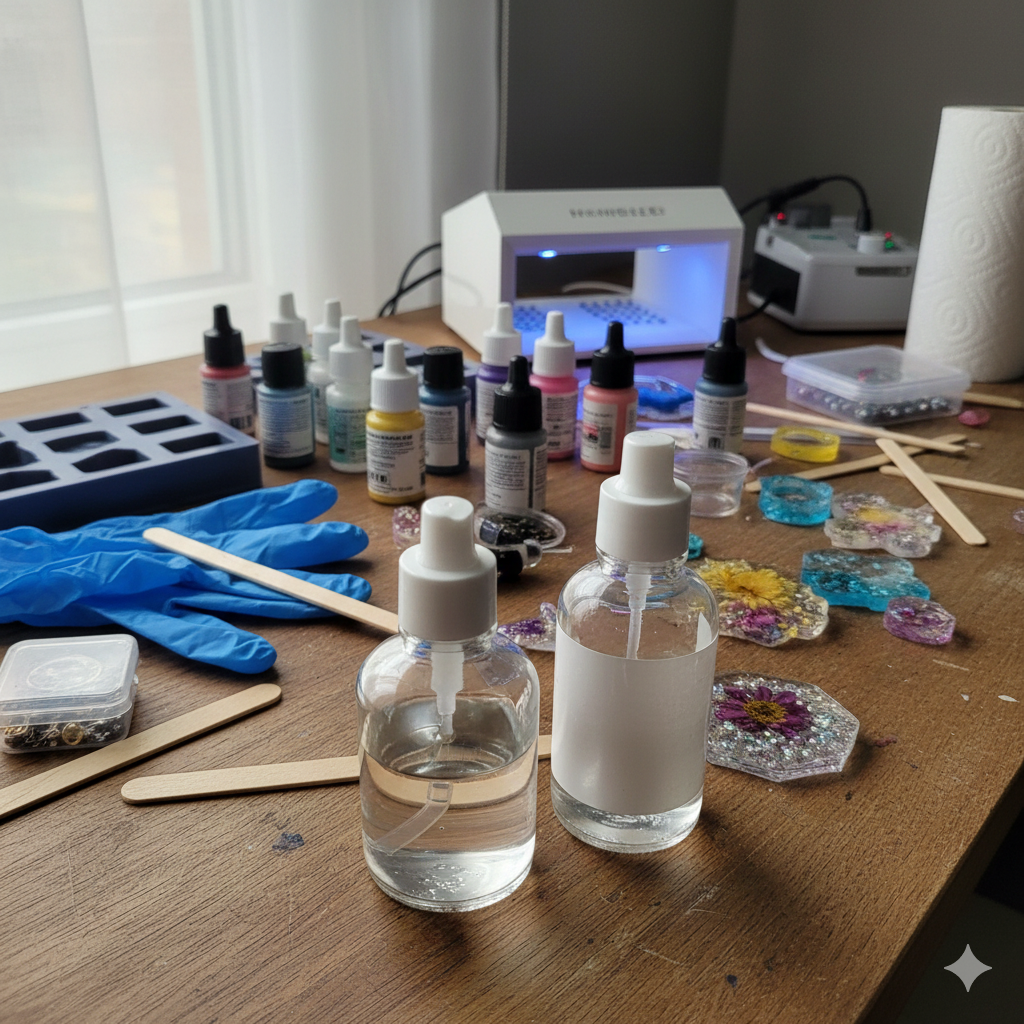 次に「アルコール」ですが、ここで絶対に確認してほしいのが水分含有量です。薬局で消毒用として売られているエタノールには、殺菌効果を高めるために20%〜30%程度の水分が含まれています。後述しますが、水分はレジンの天敵です。代用する場合は、必ず水分を含まない「無水エタノール(純度99.5%以上)」や、工業用としても使われる高純度の「IPA(イソプロピルアルコール)」を選ぶようにしましょう。