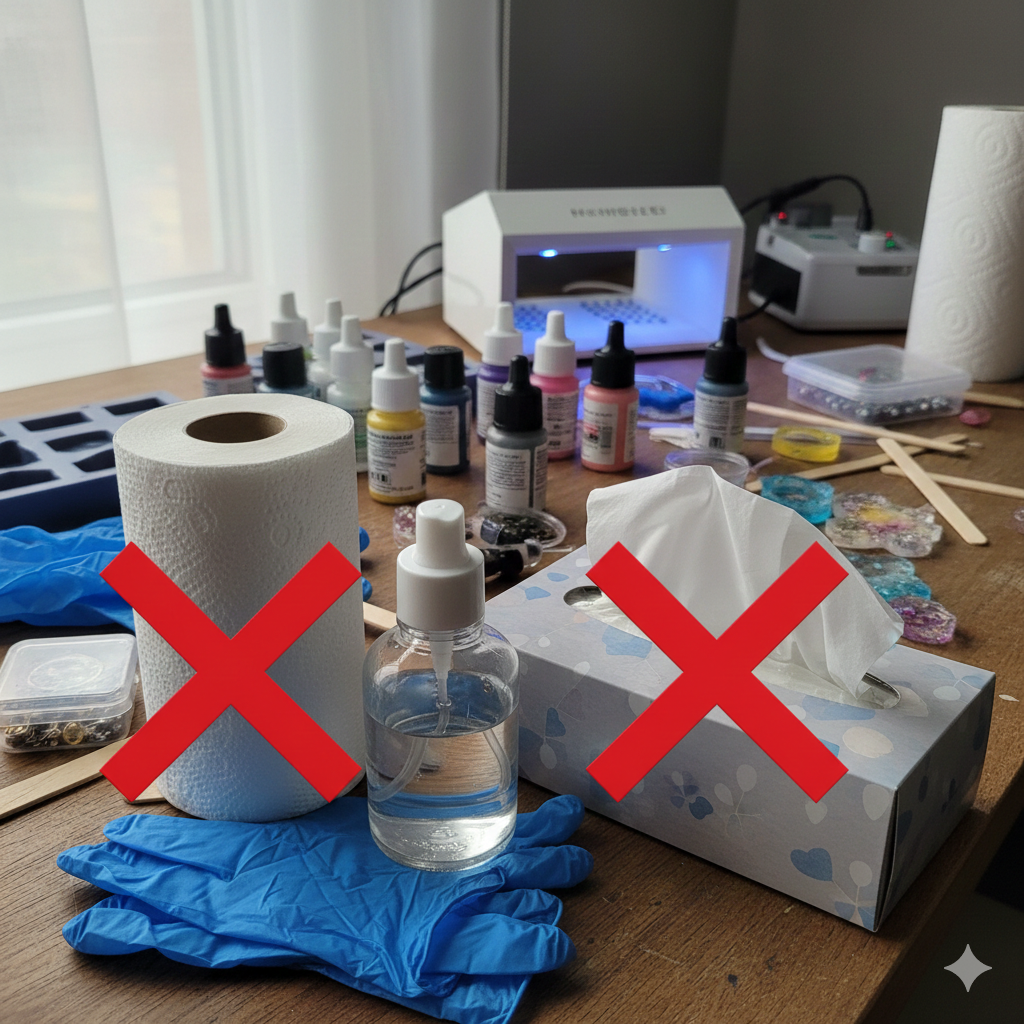 一般的なティッシュやキッチンペーパーは、濡れた状態で擦ると微細な紙の繊維(リント)が発生します。肉眼では見えにくいこの繊維が筆に残ったまま次のレジン作業に入ると、作品の中に小さなゴミとして混入してしまいます。特に透明度の高いクリア作品を作る場合、この小さな繊維が光を遮り、完成度を大きく下げる原因になってしまうのです。