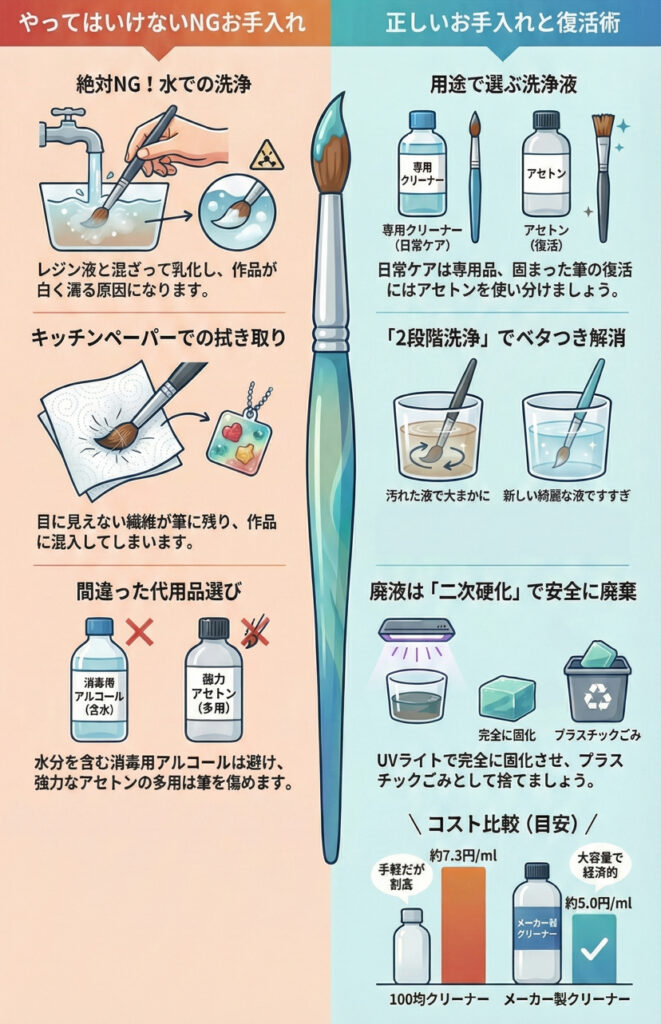 レジンを始めたばかりの頃、楽しい作品作りの後に待っている「筆のお手入れ」で悩んだことはありませんか。水彩絵の具と同じ感覚でうっかり水洗いをして筆を真っ白に濁らせてしまったり、数日後に使おうと思ったら筆先がカチカチに固まっていたりと、筆に関するトラブルは尽きないものですよね。
